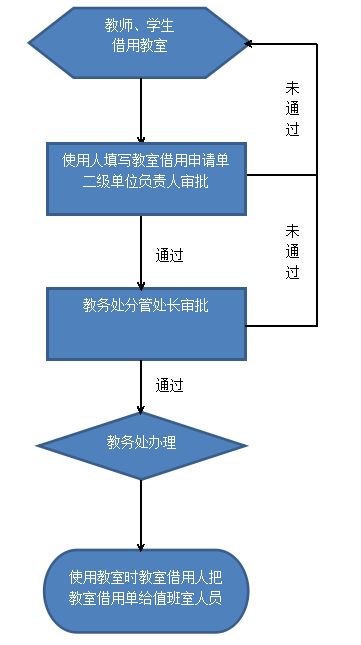 各教学单位借用本学院分配教室可以直接由本教学单位教学秘书在教务管理系统申请,教务处在系统内审批后可以直接借用教室。若借用非本教学单位所属教室的(如东、西阶梯教室等)或者晚自习期间借用教室的,需填写教室借用申请单并送至教务处,由教务处负责教室借用。